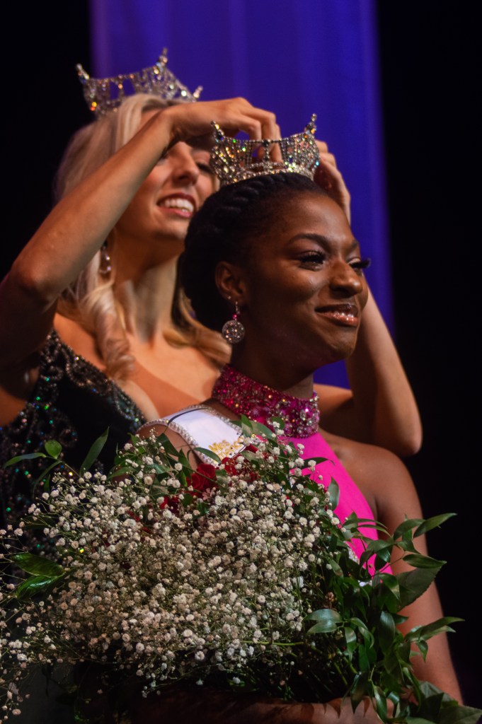 Elizabeth Pierre is crowned Miss Massachusetts 2021 by Miss Massachusetts 2019 and 2020 Lyndsey Littlefield.